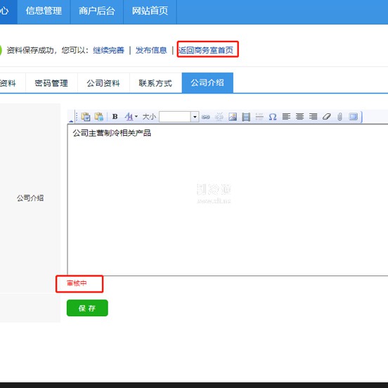 第五步: 公司簡介提交后會顯示待審核,可點擊返回上一頁繼續進行公司認證,先進性了公司認證操作的可點擊發布信息,直接把自己家的產品發布到網站上。