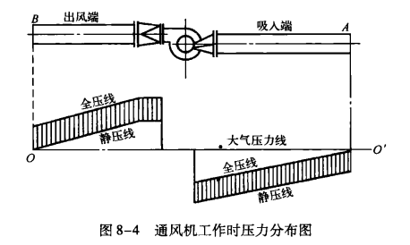 如圖8-4所示,通風(fēng)機出口全壓值最大,而通風(fēng)機的總風(fēng)壓(總?cè)珘褐?/span>),則是通風(fēng)機進出口全壓值絕對值之和。