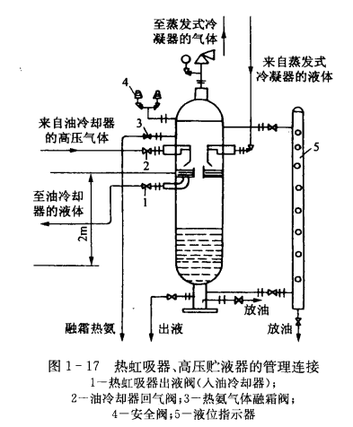 ②穿堂耗冷量為29. 8kW,汽車站臺耗冷星為30. 9kW,總共耗冷量為60. 7kW,送配N125S-T-60型螺桿壓縮機一臺,在蒸發(fā)溫度-1℃、冷凝溫度35℃時,制冷量為179. 3kW,這臺壓縮機主要供變溫間冷卻物冷藏及穿堂、汽車站臺的空氣冷卻器降溫使用。3臺螺桿式壓縮機的油冷卻,均采用高壓液體熱虹吸式冷卻系統(tǒng),見圖1-17。