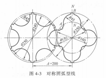 對稱型線 對稱型線是指對齒頂中心線而言的,兩邊的齒型是完全對稱的,都是口弧型線,所以稱為對稱圓弧型線,如圖4-3所示,陽轉子齒頂中線NN兩邊的曲線AB和BC型線完全相同,都是由相同的圓弧所組成的,對NN來說,這兩邊的型線是完全對稱的。對稱圓弧型線轉子,加工比較容易。對加工和裝配所引起的誤差與帶來的不良影響不像非對稱型線轉子那樣敬感.這些都是它的優點。但是,它的效率比較低,存在比較大的泄漏,因此在目前螺桿制冷壓縮機中已經很少采用T。