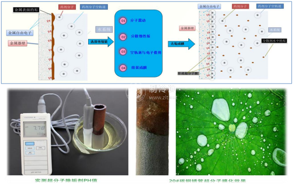 穩定的“聯姻分子”,即超分子選擇性組裝;這一過程會震動、滲透、分散污垢,并在原子態的金屬表面形成穩定的單分子層,即薄而致密的超分子膜。超分子組裝后潔的金屬表面像荷葉的表面膜層一樣,具有防腐、拒污的作用,使循環水系統的金屬表面的緩蝕阻垢率接近 100%。
