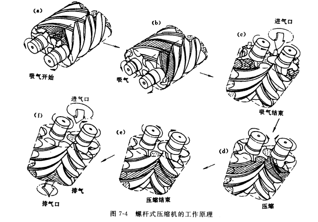 螺桿式壓縮機舒氣缸中一對螺桿轉(zhuǎn)子的相互螨合和旋轉(zhuǎn) ,造成由齒型空間組成的基元容積的變化,實現(xiàn)對制冷劑氣體的壓縮。當(dāng)壓縮機運轉(zhuǎn)時, 陽轉(zhuǎn)子帶動陰轉(zhuǎn)子(也可陰轉(zhuǎn)子帶動陽轉(zhuǎn)子)旋轉(zhuǎn) ,使由陰陽轉(zhuǎn)子凹凸齒槽,路合密封線與氣缸和端蓋內(nèi)壁所圍成的人字形基元容積不斷變化, 見圖7-4(圖中a、b為一對轉(zhuǎn)子的俯視圖,c、d、e為由下向上的仰視圖)。當(dāng)基元容積由最小向最大變化時,它與徑向和軸向吸氣口相通 ,進行吸氣過程,如圖7-4(a) (b) (c)所示。當(dāng)基元容積達到最大時,便與吸氣口隔開,此時吸氣結(jié)束。以后,基元容積由最大逐漸變小,開始氣體的壓縮過程,如圖7-4(d) (e)所示。當(dāng)基元容積內(nèi)氣體壓力升到一定值時,便開始與軸向和徑向排氣口接通 ,進行排氣過程,如圖7-4(f)所示。