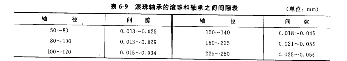 (5) 滾珠軸承的檢修。將滾珠軸承拆下后放入煤油中清洗干凈,檢查內(nèi)外環(huán)有無裂紋,內(nèi)環(huán)與外環(huán)之間的間險(xiǎn)是否在規(guī)定標(biāo)準(zhǔn)內(nèi), 見表 6-9。