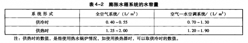 膨脹水箱的容積是由水系統中水容量和最大的水溫變化幅度決定,膨脹水箱系統的水容量參見表4-2。
