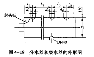 分水器起到向各路分配水流量的作用。集水器起到由各分路、環路匯集水流量的作用。分水器和集水器是為了便于連接各個水環路的并聯管道而設置的,起到均壓作用,以使流量分配均勻。分水管和集水管的管徑,可根據并聯管道的總流量,通過該管徑時的斷面流速v=1.0~1.5m/s來確定。流量特別大時,可增加流速,但不宜超過3.5m/s。分水器和集水管的外形圖如圖4-19所示。