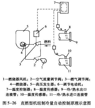 以燃氣型機組為例,對于直燃型機組來說,在全負荷條件下,燃燒器將處于最大燃燒量的狀態。當外界熱負荷減小,冷媒水出水溫度下降時,燃燒器將減小燃燒量以適應外界變化了的熱負荷。當所需燃燒器的熱量低于最小燃燒量時,燃燒器將出現斷續工作的狀態。直燃式機組制冷量調節的自動控制原理如圖5-26所示,它主要是由溫度傳感器、溫度控制器、執行機構(調節電動機)和調節閥組成的。