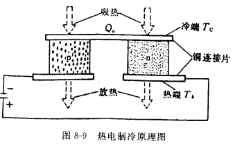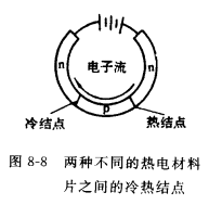 如圖8-9把一只p型半導體元件和一只半導體元件聯結成熱電偶,接上直流電源后,在接頭處就會產生溫差和熱量的轉移。在上面的一個接頭處,電流方向是mp,溫度下降并且吸熱,這就是冷端。而在下面的一個接頭處,電流方向是pn,溫度上升并且放熱,因此是熱端。