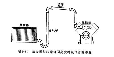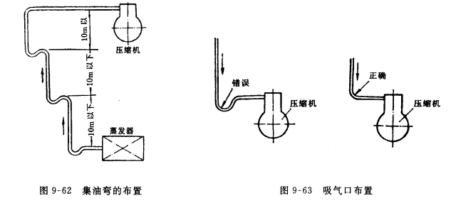4)當蒸發器布置在壓縮機下面時,為了改善回油,應每隔10m左右設置一個集油硒,如圖9-62所示。在壓縮機吸入口附近的吸氣管上不要設置集油彎,以防止啟動時滑油沖缸事故,如圖9-63所示。
