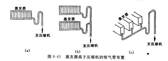 3)蒸發器布置在壓縮機上面時,應在蒸發器上側設置倒U型管,如圖9-61所示,以防開車時液體進入壓縮機而引起液擊。但對全封閉式、半封閉式壓縮機來說,當液體進入壓縮機內,先經吸氣腔予以汽化過熱,再進入汽缸,若不設倒U形管,問題也不大。