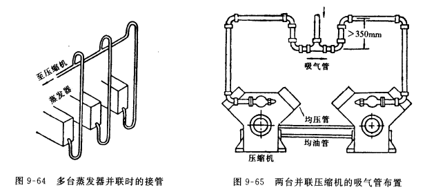 6)當多臺蒸發器并聯時,為了不因某一臺或某幾臺東發器的負荷變化或停止運行時影響其他蒸發器的正常工作。可采用如圖9-64所示接法。