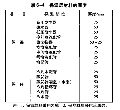 機組各部分的保溫層應施工完好,以防止熱量的浪費。機組中放熱損失約占加熱量的2%~ 4% ,蒸汽型機組中配管損失約占3%,應引起足夠的重視。特別是對于安裝在室外的機組,保溫層施工更為重要。室內設置機組保溫層材料的厚度參見表6-4。