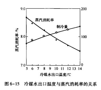 冷媒水的出口溫度升高時,蒸發壓力升高,機組吸收能力增強,稀溶液的質量分數下降,溶液的質量分數差增大,機組的熱效率提高。冷卻水的出口溫度一定(41℃)時,冷媒水的出口溫度與蒸汽消耗率的關系,如圖6-15所示。隨著冷媒水出口溫度升高,蒸汽消耗率降低。因此,工藝生產或某些空調場所需用較高的冷媒水溫度時,無須使機組在設計工況下制取7℃冷媒水,然后將冷媒水送人冷媒水池,混人較高溫度的水,再用另一個冷媒水泵送至需要的地方,而應提高冷媒水出口溫度運行以提高機組的熱效率,節約能源。但應注意冷媒水溫度不能提高過多,而應在機組提供的冷媒水出口溫度范圍內運行,否則機組運行中會發生故障。