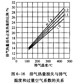 在直燃型機組運行過程中,調節過量的空氣系數n,減小過剩的空氣量,可減小排氣的熱量損失,達到節能運行的目的。如圖6-16所示為排氣熱量損失與排氣溫度和過量空氣系數的關系曲線。