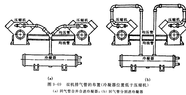 核心提示:當冷凝器位置低于壓縮機時,可按圖9-69布置排氣管道。裝均油管的目的是使兩臺壓縮機的油面在同一水平面上,均壓管是使兩臺壓縮機的曲軸箱具有相同的壓力。