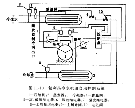 水流量繼電器8分別安裝在蒸發器與冷凝器進水管及回水管之間 ,當茹發器或冷凝器的冷卻水量過低時,自動停止壓縮機運轉 ,以防 蒸發器凍結或冷凝壓力過高。