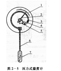 壓力式溫度計的結構原理如圖2-5所示。由感溫包、毛細管和彈竹管組成的封閉空間內充滿液體(或氣體)。當被測溫度發生變化時,溫包內的液體體積由于熱脹冷縮而發生變化,對彈簧管的壓力也發生變化,追使彈竹管變形而使其自由端發生偏轉,帶動指針指出被測的溫度值。