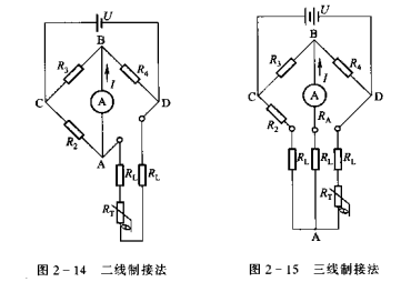 設(shè)每根導(dǎo)線電阻 (連同其調(diào)整電阻在內(nèi))為RL,在兩線制接法中,A、D之間的橋警電阻為 2RL + RT,RL的變化,對測量精度影響較大,在三線制接法中,兩個RL分別串入CA和AD橋?qū)?RL變化的影響可以在很大程度上被排除掉,使測量誤差減小。盡管RL電阻也串接在檢流計支路中,它的阻值變化對檢流計電流工仍有影響,但較之二線制接法來說 ,還是優(yōu)越得多。