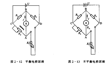 2)不平衡電橋。圖2 - 13所示為不平衡電橋的原理圖。圖中的R2、R3、R4 都是標準國定電阻,RA是檢流計內(nèi)阻。當(dāng)被測溫度變化時,熱電阻 RT的阻值也要發(fā)生變化,電橋的平衡 被破壞,檢流計中的電流不再為零。溫度變化越大,電括的不平衡 越嚴重 ,檢流計中的電流就越大,指針偏轉(zhuǎn)也越大。根據(jù)檢流計指針偏轉(zhuǎn)角度的大小,可以在溫度刻度盤上直接讀出進度值。