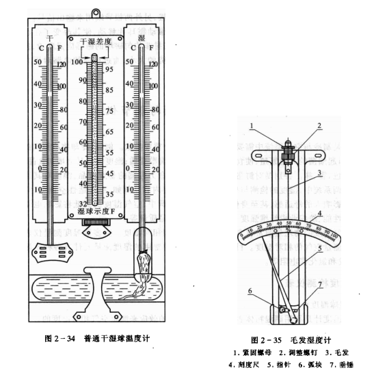 濕球溫度計是利用潮濕物體表面水分蒸發冷卻的效應來測定空氣相對濕度的。干濕球溫度計由兩支完全相同的溫度計組成,如圖2-34所示。一支用于直接指示空氣的溫度,稱為干球溫度計;另一支溫度計的溫包上包有細紗布,紗布的末端浸在盛水的小瓶里,由于毛細管作用,紗布將水吸上來,使溫包周圍經常處于濕潤狀態。該溫度計指示濕球溫度,稱為泛球漁度計。由于濕球上水分蒸發吸熱,使溫球表面空氣層的溫度下降。因此,濕球溫度通常總是低于干款溫度。干濕球溫度差與被測空氣的濕度有關。空氣越干燥,且球上水分車發越快,干濕球溫度差越大;空氣越潮濕,濕球上水分蒸發越慢,干濕球溫差越小;若是他和空氣,則于濕球溫度差為零。知道了干濕球溫度計的讀數后,就可以通過查表或計算,求得空氣的相對濕度。