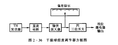 TH型干濕球信和號發(fā)送器與TS系列濕度調(diào)節(jié)器配合,可實現(xiàn)洗度的偏差指示、雙位、三位、比例-積分的比例-積分-微分調(diào)節(jié)。輸出信號可分為繼電器開關(guān)信號和連續(xù)電流輸出信號(0~10mA)。干濕球濕度調(diào)節(jié)器方框圖2-36所示。
