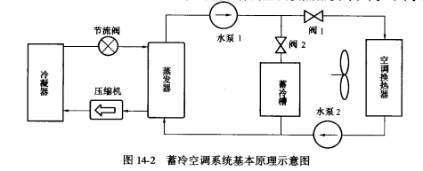 圖14-2所示是蓄冷空調系統基本原理示意圖,它在常規空調系統的供冷循環系統中增添了一個既是與蒸發器并聯也是與空調換熱器并聯的蓄冷槽,并增添一個水泵2和兩個閥門。這樣,原供冷循環回路就可以出現以下幾種新的循環方式: