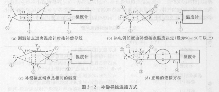 其一,熱電偶的長度由補償點的溫度決定。熱電偶長度與補償導線長度要最佳配合,例如,熱電偶長 50 cm 補償導線5 m為宜。補償導線使用溫度為90~150℃。它與熱電偶連接如圖2- 2所示,圖中,①為熱電偶,②為測溫結點,③為補償結點,四為基準結點;加為補償導線。熱電偶與補償導線結點(這點稱為補償結點)的溫度不能超過補償導線的使用溫度,如圖2- 2(b)所示。熱電偶變冷,如圖2- 2(d)所示, 需 要把熱電偶伸長到補償導線的使用溫度范圍。因此,測量結點溫度高 ,熱電偶可長 ;溫度低,熱電偶可短。補償結點間要做到沒有溫差。