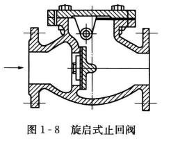 (2)旋啟式止回閥。旋啟式止回閥的閥瓣圍繞閥座外的銷軸旋轉(zhuǎn)。旋啟式止回閥多安裝于水平管道上。圖1-8為旋啟式止回閥的內(nèi)部結(jié)構(gòu)。止回閥的連接可以有絲扣式、法蘭式、對(duì)夾式、卡箍式等。
