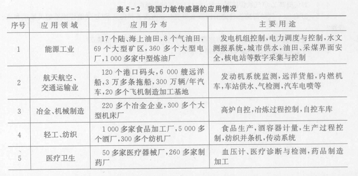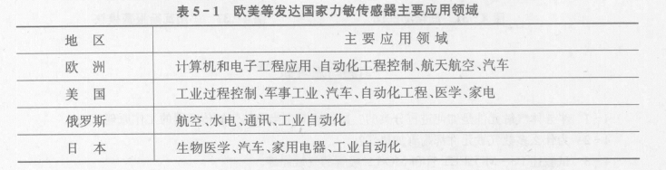 力敏傳感器在國(guó)內(nèi)外發(fā)展都比較迅速,特別是微電子技術(shù)的發(fā)展,以微機(jī)械加工、二維大規(guī)模集成電路技術(shù)為代表的高新技術(shù)市場(chǎng)化應(yīng)用,把力敏器件與傳感器產(chǎn)業(yè)化推向了新階段。表5-1和表5-2分別顯示了力敏傳感器在國(guó)內(nèi)外的主要應(yīng)用領(lǐng)域,這表明力敏傳感器在工業(yè)生產(chǎn)中占有舉足輕重的地位。