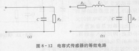 電容式傳感器在大多數(shù)情況下,由于使用的環(huán)境溫度不是很高,濕度不是很大,若供電電源頻率較合適,設計合理,可以用一個純電容來等效。但是當在供電電源頻率較低或者高溫、高濕的環(huán)境條件下使用的時候,傳感器電極問電路可以等效為圖8-12(a)所示的電路,圖中C是傳感器電容(包括應該盡量消除和減小的寄生電容),Rp為電極間的等效漏電阻,包括電極絕緣支架的介質損耗和極間的介質損耗。隨著供電電源頻率增高,傳感器容抗減小,Rp的影響也就減弱。電源頻率高到幾兆赫效時,Rp可以忽略,但是電流集膚效應使得電阻增加,必須考慮傳輸線(一般為電纜)的電感和電容。這時其等效電路可以用圖8-12(b)所示的電路表示。圖中考慮了電容器的損耗和電感效應,Rp為并聯(lián)損耗電阻,它代表極板間的泄漏電阻和介質損耗。這些損耗在低頻時影響較大,隨著工作頻率的增高,容抗減小,其影響就減弱。
