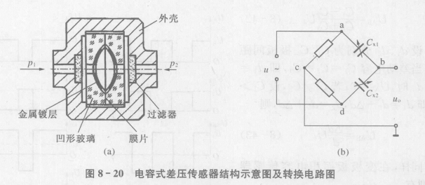 圖8-20(a)所示為差動電容式壓力傳感器的結構圖,其轉換電路如圖8-20(b)所示。圖中所示為一個膜片動電極和兩個在凹形玻璃上電鍍成的固定電極組成的差動電容器。
