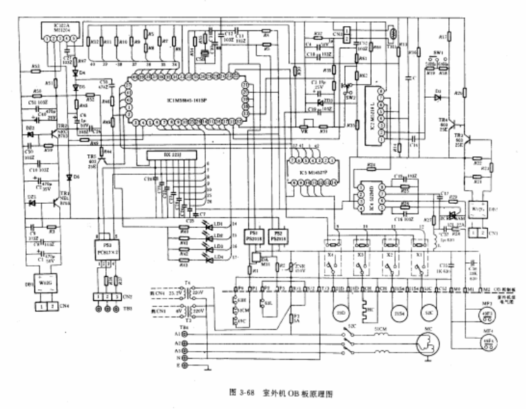 圖3-68是室外機OB板的原理圖。380V電源從TB4送入,經保險絲F3和N端向變壓器T3和T4輸入交流220V。T3次級輸出交流6V,從接插件CN1到DB2(W02G)整流后,輸出取樣信號送給TR3、TR4管放大。變壓器T4次級輸出交流23.2V,從接插件CN4到DB1C(W02G整流、C1濾波后,送給電源調整管TR1、DZ1和TR2、DZ2等元件組成的直流穩壓電路,向OB板提供穩壓電源。室內機送來的制冷控制信號由CN2的1、2端輸入到光電耦合器PS3的1、2腳(PS3內部由兩組PC817光電耦合器組成)再從其7、8腳輸出信號到單片機IC1(M58845-161SP)的2和6腳,則IC1發出操作指令,IC1的(42)腳輸出高電平到功率驅動芯片IC5(M54527P)的3腳,其對應輸出端(12)腳呈低電平,繼電器X1吸合,X1的常開觸點閉合,接通接觸器52C的工作電源,52C觸點閉合,壓縮機MC啟動,進行制冷。同時,IC1的控制指令通過溫控電路送到IC4(522MD),再IC4由等元件組成的觸發電路,控制雙向可控硅BCR導通,而使室外風機運轉。用于測量冷凝器溫度的熱敏電阻TH3由CN3接入,變化信號通過與標準源電路比較后饋送至IC1,并通過IC2(M5218L)向IC4輸出信號,控制雙向可控硅BCR的觸發信號,自動調整室外風機MF3和MF4的運轉速度。當CN2的1、2間控制信號為0V時,IC1的(42)腳由高電平變為低電平,繼電器X1釋放,壓縮機停止運轉,但風機照常排風,直到TH3的冷凝溫度到達下限值時,觸發信號截止,可控硅即關閉風扇MF3、MF4 電源。溫度上升后,又根據室內機送入的控制信號重復上述制冷程序。