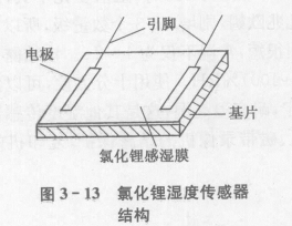 結(jié)構(gòu):氧化鋰濕敏電阻是利用吸濕性鹽類潮解,離子導(dǎo)電率發(fā)生變化而制成的測濕元件。由氧化鋰感濕膜電極,基片和引腳組成,其結(jié)構(gòu)如圖3-13所示。