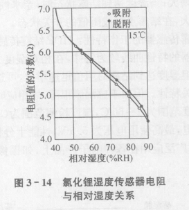 特性:化鋰濕度傳感器測量范圍為(10~95)%RH,在(50~80)%RH相對(duì)濕度范圍內(nèi),電阻和濕度呈線性變化關(guān)系,工作溫度為-10~50℃,響應(yīng)時(shí)間小于60s。氯化鋰濕度傳感器的濕度-電阻特性曲線如圖3-14所示。氯化鋰濕敏元件的優(yōu)點(diǎn)是滯后小,不受測試環(huán)境的影響,測量精度達(dá)(±2~5)%RH,但其耐熱性能差,不能用于露點(diǎn)溫度以下測量,其重復(fù)性不理想。