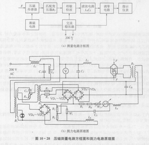 10-27是一種壓磁式傳感器的簡單測量電路。圖中B1、B2分別是降壓和升壓變電器,其B1輸出提供壓磁傳感器的初級繞組的勵磁電壓,而B2,則用以提高傳感器的輸出電壓。濾波器LB1和LB2的作用,前者是濾除壓磁元件輸出的高次諧波,后者則是濾除電橋整流的脈動(波紋),使輸出為比較好的直流電壓信號,以此供電壓表(模擬的)或負載使用。虛框的電路為補償電路,其中R1、R2分別用來調整電壓幅值和相位,以達到零位電壓的補償目的。
