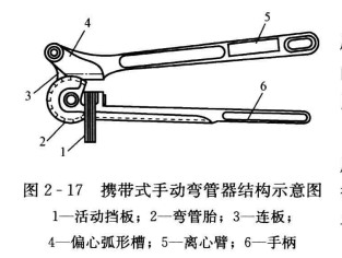 攜帶式手動彎管器的結(jié)構(gòu)如圖2-17所示。操作時,將被彎管子放在彎管胎槽內(nèi),一端固定在活動擋板上,推動手柄,即可將管子彎曲到所需要的角度。