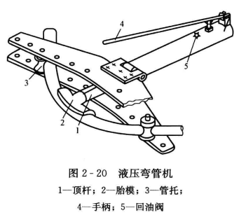 液壓彎管機的構(gòu)造如圖2-20所示。使用液壓彎管機彎管時,先把頂胎退至管托后面,再把管子放在頂胎與管托的弧形槽內(nèi),并使管子彎曲部分的中心與頂胎的中點對齊,然后開動機器,將管子彎成所需要的角度。彎曲后,開倒車把頂胎退回到原來位置,取出彎好的彎管,檢查角度。若角度不足,可繼續(xù)進行彎曲。
