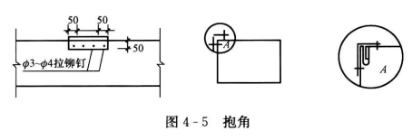 2、風管按照扣式咬口若開裂,可以用與風管同質材料做一個50mm X50mm, 90°的抱角,用?3~?4的拉鉚釘固定,將風管咬口開裂處修補好。抱角長度應當大于風管開裂長度100mm左右,如圖4-5所示。