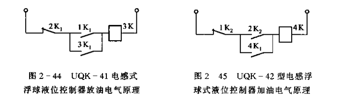 由上面的分析可知,浮子進入膠木開關盒,繼電器K吸合;浮子離開膠木開關盒,繼電器K釋放。由于浮子很小,控制的液位幅差范圍也很小,而且不可調。一般用兩個(或多個)膠本開關.一個做下限液位控制,一個做上限液位控制。同時,在電氣線路上設自鎖觸點,以保達只有在到達另一限位時才改變原來的動作狀態。一UQK-41/42電氣盒內帶有自鎖觸點(無自鎖觸點的,使用單位需另配中間繼電器)。圖2-44所示為UQK-41型放油電氣盒電氣線路圖。