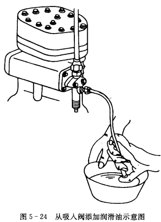 ①關閉吸入閥多用孔道 ,用接管的一端接多用孔道 ,另一端能到盛油容器中, 見圖5- 24。