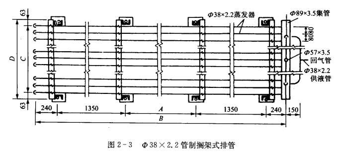擱架式排管一般采用D32X2.2或038 X 2. 2無縫鋼管制作。每排管子的水平中心距為80~10mm,每層管子的垂直中心距一般為250~400mm,最低一層距地坪的高度不宜小于250mm,最高一層管子距地坪的高度不宜大于1800mm,以便于操作。擱架式排管的寬度當單