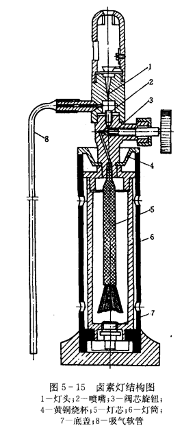 充氟利昂檢漏時,可在系統內充入少量的氟利昂氣體,使系統內壓力達0. 2~ 0. 3MPa。然后開始檢漏,氟利昂檢漏可使用鹵素燈,鹵素檢漏儀。鹵素燈又名校漏儀,它的結構見圖5-15所示。