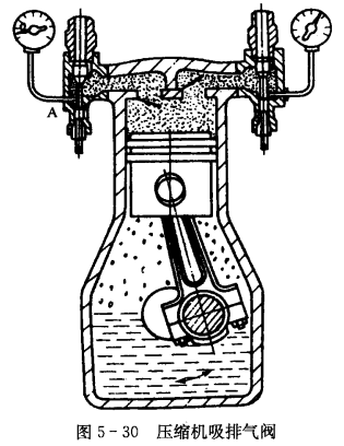 見圖5-30關閉吸氣截止閥,讓壓縮機運轉幾分鐘,將曲軸箱內的制冷劑抽入冷凝器,停車并立即關閉排氣截止閥,在吸、排氣截止閥的旁通孔各裝上高、低壓表。再開車,微松吸氣截止閥旁通孔接管的接扣(見圖中的A處),讓空氣緩慢吸入壓縮機。使壓縮機的排氣腔內壓力慢慢上升。當升至一定壓力,一般為0. 98MPa表壓力時,旋緊接扣停止吸入空氣,并讓壓縮機繼續運轉幾分鐘停車。停車10min,看低空真空度回升悄況,若10min內高、低壓力平衡了。這說明閥板有嚴重滲漏,需一予拆修。然后,裝好再作0.98MPa充氣工作。并繼續運轉,根據吸氣下降值來判斷壓縮機的效率。吸氣壓力下降到什么數值的真空度,壓縮機才算好用呢?不同用途的制冷設備有不同的要求,可參考表5-9中的數據。