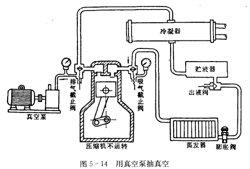 因大缸徑壓縮機(jī)用自身抽空有危險(因?yàn)榕艢饪谳^?。?,而半封閉壓縮機(jī)用自身抽空時,電動機(jī)冷凍條件差,用真空泵抽真空的示意圖如5-14所示。