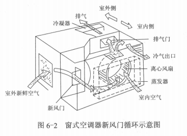 山東德州新風系統主要由新風門和混濁空氣排出門組成。新風門設置在空調器吸風側,可通過控制面板上的旋鈕或滑桿來控制其開、關。當空調器運行時,打開新風門,室外新鮮空氣從新風門吸入與室內經熱交換后的循環空氣混合,后送至室內。排風門設置在空調器排風側,于排除室內混濁空氣。圖6-2所示,是窗式空調器的新風循環示意圖。
