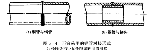 相同直徑紫銅管的對(duì)焊,應(yīng)采用插入焊的結(jié)構(gòu)形式。紫鋼管的一端用鋼沖模沖成擴(kuò)口,將接頭部分內(nèi)外表面用砂布擦亮,并插入擴(kuò)口內(nèi)壓緊,以免焊接時(shí)焊料從間隙流進(jìn)管內(nèi),焊接時(shí)最好將管子垂直安放。同管徑對(duì)接時(shí),不宜采用如圖5-4所示的焊接方式,因紫銅管壁薄,難保證焊接質(zhì)量。