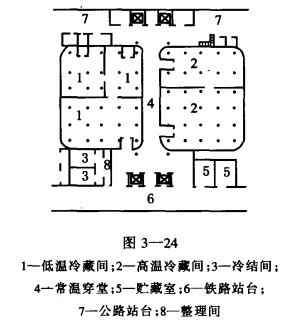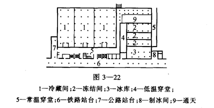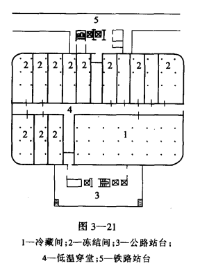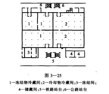 圖3-25是不同溫庫房的分邊設計平面。這種平面布置既節省了隔熱外墻和中間穿堂面積,又同樣可以取得圖3-24的效果。