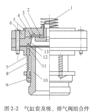 氣缸套的中部周?chē)O(shè)有頂開(kāi)吸氣閥閥片的頂桿和轉(zhuǎn)動(dòng)環(huán),轉(zhuǎn)動(dòng)環(huán)液壓缸拉桿機(jī)構(gòu)控制,用以調(diào)節(jié)壓縮機(jī)的排氣量和起動(dòng)時(shí)卸載之用,圖2-2所示為氣缸套及吸排氣閥組合件。