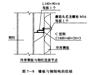 圍護堵板轉(zhuǎn)角處的連接 可直接采用濟南預制的冷庫角板,與頂板、墻板拉結(jié)的方法同上,并在庫板交接的外角處包預制角鐵,涂上硅有機樹脂密封堵塞,或如圖7-8所示進行轉(zhuǎn)角的連接。