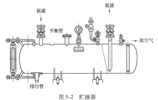 貯液器又稱高壓貯液桶。在制冷系統(tǒng)中是用以調節(jié)和穩(wěn)定氨液循環(huán)量,并貯放氫液。貯液器如圖5-2所示。
