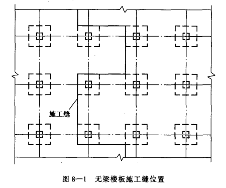 6.無梁樓板的混凝土應連續澆注,不宜留施工縫,不得不留時,應將施工縫留在柱帽邊線處,并做成折線形斜坡形。如圖8-1所示。